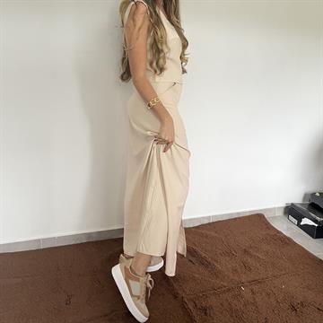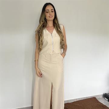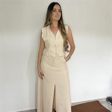 A blusa de modelagem cavada valoriza os ombros e o zíper frontal confere um toque urbano ao visual, enquanto a saia longa com fenda frontal garante leveza, movimento e sensualidade na medida certa.